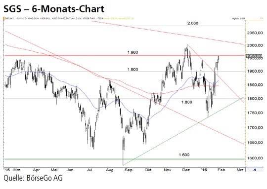Rückblick: Nach einem gescheiterten Ausbruchsversuch über die Kurshürde bei 1.960 CHF im März 2015 fielen die Aktien von SGS ein zweites Mal an die zentrale Unterstützung bei 1.600 CHF zurück.