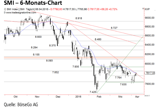 Kurzfristig haben die Bullen beim SMI jetzt die Chance, die Erholung fortzusetzen. Die Abwärtsrisiken aufgrund der jüngsten Verkaufssignale dominieren jedoch weiter. Die Short-Szenarien: Oberhalb der 7.764 Punkte-Marke könnte sich die Erholung bis an den Widerstand bei 7.852 Punkten ausdehnen. Dort sollte man sich auf Gegenwehr seitens der Bären und eine entsprechende Verkaufswelle einstellen. Wird die Haltemarke bei 7.764 Punkten in diesem Zuge unterschritten, käme es zu einem Ausverkauf bis 7.635 Punkte. Sollte diese Marke ebenfalls durchbrochen werden, dürfte es bereits zu einem mehrtägigen Abwärtsimpuls bis an die zentrale Unterstützung bei 7.425 Punkten kommen. Die Long-Szenarien: Dagegen hätte ein Anstieg über die Hürde bei 7.852 Punkten eine weitere Aufwärtsbewegung zur Folge, die den SMI direkt wieder an die Barriere bei 7.935 Punkten führen dürfte. An dieser Stelle könnten die Bären allerdings erneut zuschlagen und den Abwärtstrend der letzten Tage fortsetzen. Erst ein nachhaltiger Anstieg über diese Widerstandsmarke würde für die Bullen und eine Erholung bis 8.093 Punkte sprechen.