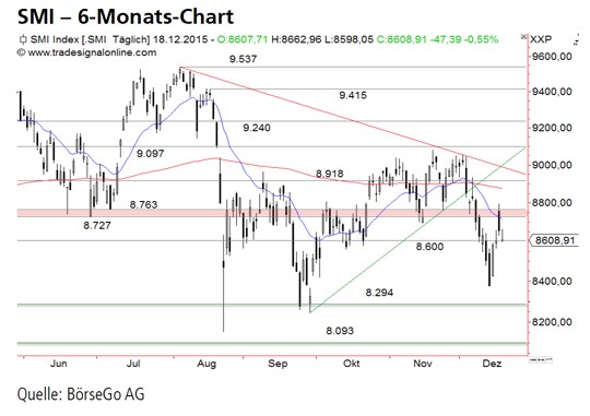 Rückblick: Der SMI Index stoppte seine dynamische Aufwärtsbewegung Mitte November an der Hürde bei 9.097 Punkten und begann mit dem Bruch der bis dahin federführenden Aufwärtstrendlinie eine scharfe Korrektur.