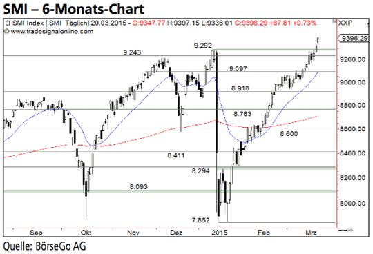 Ausblick: Die Stärke der Käuferseite ist absolut beeindruckend. Nach dem Ausbruch der letzten Woche hat der SMI sogar das Potenzial, bis an sein Allzeithoch aus dem Jahr 2007 anzusteigen. Die Long-Szenarien: Im kurzfristigen Bild könnte der SMI jetzt an die nächsthöhere Hürde bei 9.400 Punkten haussieren. An dieser Stelle könnte es zu einem bullish zu wertenden Rücklauf an die 9.292 Punkte-Marke kommen. Aufgrund der aktuellen Aufwärtsdynamik ist den Käufern jedoch auch ein direkter Ausbruch über 9.400 Punkte zuzutrauen. In diesem Fall käme es zu einer Kaufwelle bis 9.500 Punkte. Mittelfristig dürfte schliesslich auch das Rekordhoch bei 9.548 Punkten angelaufen werden.