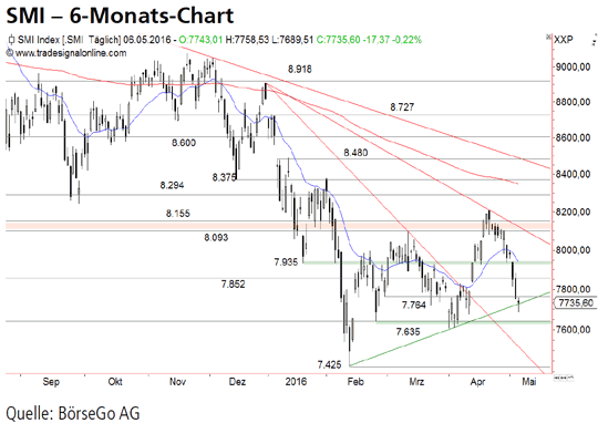 Mitte April endete die Erholung seit Anfang Februar beim SMI Index mit dem Rückfall unter die Unterstützung bei 7935 Punkten. Seither geben die Bären den Ton an.