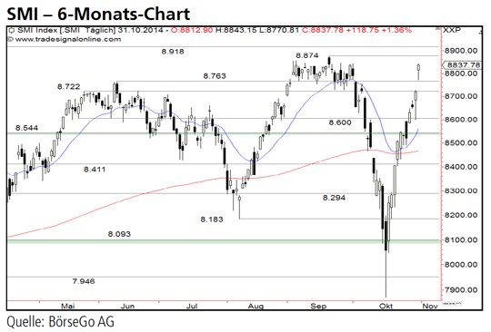 Rückblick: Der SMI Index brach Anfang November im Rahmen des steilen mittelfristigen Kaufimpulses schliesslich auch über das Jahreshoch bei 8.874 Punkten und den langfristigen Widerstand bei 8.918 Punkten aus.