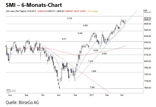 Rückblick: Anfang Februar setzte beim SMI Index eine weitere Kaufwelle ein, die den Wert über den markanten Widerstand bei 8.480 Punkten antrieb.