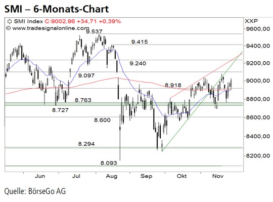 Ausblick: Mit dem zweiten Standbein in der Unterstützungszone um 8.750 Punkte könnte sich der SMI nun weiter nach oben absetzen. Der schnelle Konter auf die zwischenzeitliche Schwäche spricht für anhaltendes Kaufinteresse. Die Long-Szenarien: Das jüngste Hoch bei 9.080 Punkten und die Horizontale darüber bei 9.097 Punkten bilden die kurzfristig relevanten Widerstände. Kann der SMI beide Marken hinter sich lassen und damit auch neue Hochs markieren, wäre die Aufwärtsbewegung seit August bestätigt. Erst bei 9.240 Punkten wäre in diesem Fall die nächste Hürde im Chart auszumachen. Dort verlaufen auch die Begrenzungslinien der zuletzt benannten bearishen Keilformation und könnten den Kurs zusätzlich hemmen. Dagegen wäre über 9.240 Punkten der Weg auf 9.415 Punkte frei. Die Short- Szenarien: Fällt der SMI dagegen wieder unter 8.918 Punkte zurück, dürfte er ein drittes Mal die Unterstützungszone zwischen 8.763 und 8.727 Punkten testen. Erst unter 8.727 Punkten würde sich das Chartbild aber deutlicher eintrüben. Der Index könnte dann die Marke von 8.600 Punkten ansteuern.