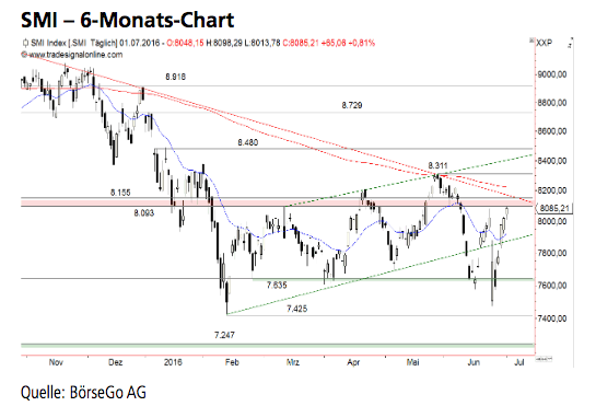 Dass der überraschendere Ausgang des Brexit-Referendums nach einem ersten Schock eine starke Kaufwelle nach sich zog, kann bullish bewertet werden. Allerdings hat der Index mittlerweile eine Widerstandszone erreicht. Die Long-Szenarien: Setzen sich nach einem kleinen Rücksetzer die Bullen durch und führen den SMI über die 8.155 Punkte- Marke sowie den dort liegenden Abwärtstrend, ist ein Anstieg bis zur 8.311 Punkte-Marke möglich. Ein Ausbruch über diesen Widerstand würde für einen Doppelboden sprechen, sodass mittelfristig ein Anstieg bis in den Bereich der 8.480 Punkte- Marke und später zur Widerstandszone bei 8.729 Punkten eingeleitet werden könnte. Die Short-Szenarien: Es besteht im Bereich der Widerstandszone zwischen 8.093 Punkten und 8.155 Punkten die Gefahr, dass sich der SMI noch einmal nach unten bewegt. Wird der Abwärtstrend dabei bestätigt und die 7.800 Punkte-Marke unterschritten, ist ein Kursrückgang bis zur 7.635 Punkte-Marke kurzfristig wieder möglich. Darunter besteht die Gefahr, dass die Jahrestiefs bei 7.425 Punkten vollständig erreicht werden, bevor sich dort die Chance einer Zwischenerholung bietet.