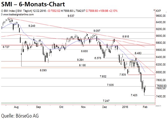 Die Short-Szenarien: Nach einem leichten Anstieg an die frühere Unterstützung bei 7750 Punkten dürfte der Wert erneut von den Bären ausverkauft werden. Sollte dabei auch das bisherige Tief bei 7425 Punkten unterschritten werden, dürfte das Korrekturtief aus dem Jahr 2013 bei 7247 Punkten angesteuert werden. Diese Marke könnte allerdings zum Ausgangspunkt für eine mittelfristige Bodenbildung und eine entsprechend weitreichende Gegenbewegung werden. Setzt der SMI jedoch auch unter diese Unterstützung zurück, würde ein Einbruch bis 7110 Punkte und darunter bereits bis 6.990 Punkte belasten.