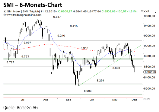 Rückblick: Nachdem der SMI Index im Rahmen seiner steilen Aufwärtsbewegung Mitte November an der Widerstandsmarke bei 9.097 Punkten gescheitert war, setzte der Index in der Folge auch unter die mittelfristige Aufwärtstrendlinie zurück.