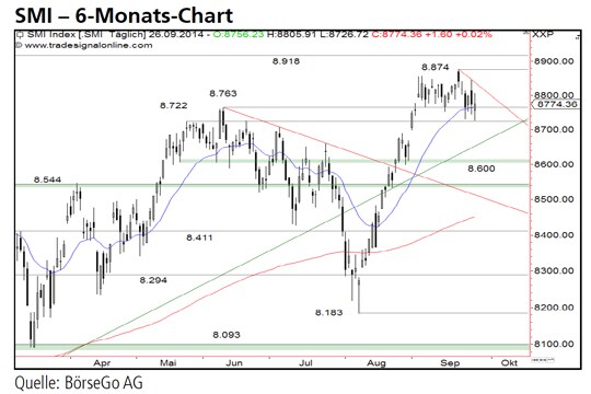 Ausblick: Der SMI hat die bullishe Ausgangslage der letzten Wochen nicht in weiter steigende Kurse umsetzen können. Aktuell besteht zwar die Chance auf die Ausbildung eines Doppelbodens an der 8.722 Punkte-Marke. Ein Bruch der Unterstützung würde jedoch für die Fortsetzung der Korrektur sprechen. Die Long-Szenarien: Ausgehend von 8.722 Punkten könnte der SMI nochmals an das bisherige Verlaufshoch bei 8.874 Punkten ansteigen. Diese Hürde dürfte nicht ohne weiteres zu durchbrechen sein. Sollte dies den Käufern dennoch gelingen, könnte ein Aufwärtsimpuls über den Widerstand bei 8.918 Punkte führen. In diesem Fall dürfte der Index unmit - telbar bis 9.000 Punkte haussieren. Die Short-Szenarien: Setzt sich die leichte Korrekturphase dagegen fort und wird die Un - terstützung bei 8.722 Punkten durchbrochen, käme es zu ei - nem vorübergehenden Verkaufssignal. In der Folge dürfte der SMI bis an die 8.600 Punkte-Marke ausverkauft werden, ehe er sich auf diesem Niveau wieder erholen und die Aufwärts - tendenz fortsetzen dürfte. Bei einem Bruch der 8.600 Punkte- Marke könnte dagegen nur mehr die Unterstützung bei 8.544 Punkten einen Rückfall auf 8.411 Punkte aufhalten.