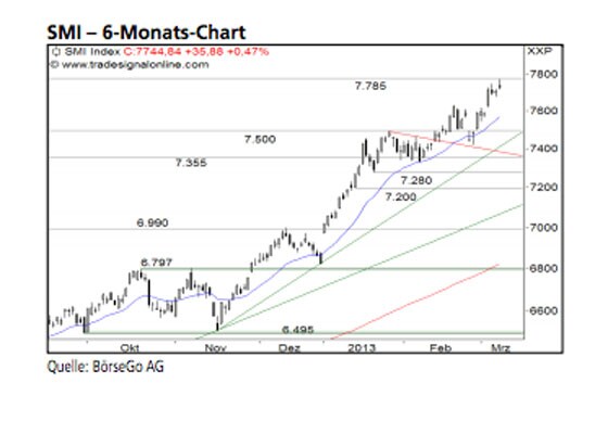 Rückblick: Seit Mitte November befindet sich der SMI Index in einer weiteren dynamischen Kaufwelle und brach in deren Verlauf Mitte Februar über den Widerstand bei 7.500 Punkten aus.