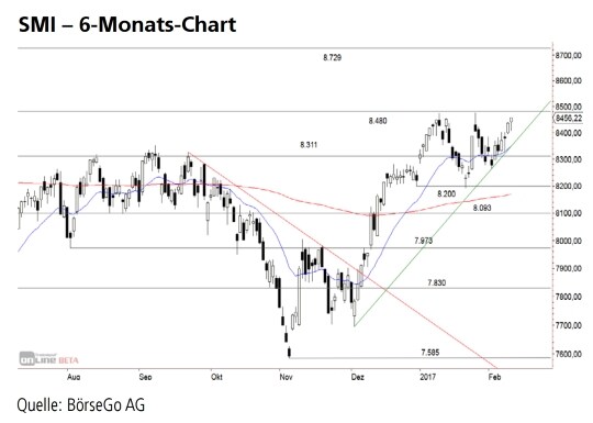 Der SMI drängt verstärkt gegen den bei 8.480 Punkten