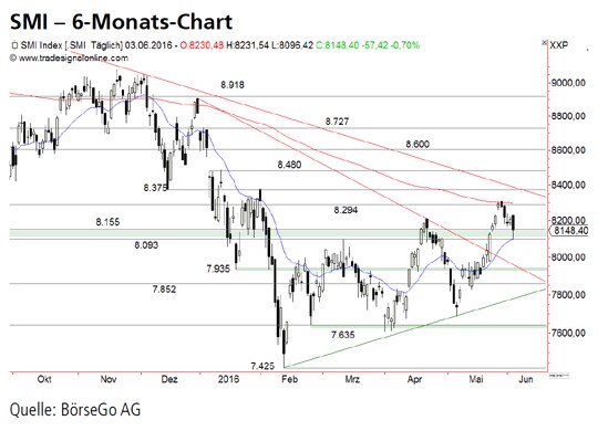 Rückblick: Anfang Mai gelang der Käuferseite beim SMI Index eine dynamische Trendwende, nachdem der Index zuvor von einem Verlaufshoch bei 8.210 Punkten bis 7.689 Punkte eingebrochen war.