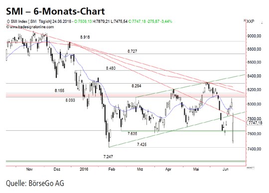 Ausblick: Dass der starke Kurseinbruch zur Handelseröffnung am Freitag in der Summe von der Käuferseite zu einem Konter genutzt wurde, kann zunächst positiv bewertet werden. Dennoch wurde der bestehende Aufwärtstrend wieder klar nach unten verlassen. Ein nervöser und volatiler Marktverlauf sollte den Wochenbeginn begleiten, bevor eventuell ein neuer Trend etabliert werden kann. Die Short-Szenarien: Nach dem Einbruch vom Freitag könnte der seit August 2015 bestehende Abwärtstrend wieder aufgenommen werden und den SMI zunächst in Richtung des Tiefs bei 7.425 Punkten führen. Hält dieser Kursbereich den Bären nicht stand, wird der Weg zur 7.247 Punkte-Marke frei, bevor mittelfristig auch die 6.990 Punkte-Marke ins Blickfeld rücken kann. Die Long-Szenarien: Die Gegenbewegung nach dem Ausverkauf am vergangenen Freitag könnte durchaus den Beginn einer umfassenderen Erholung darstellen. Sofern der SMI über die 7.880 Punkte-Marke steigen kann, wird die Widerstandszone bei 8.093 Punkten bis 8.155 Punkten wieder erreichbar. Mittelfristig wird es für die Bullen erst bei einem Ausbruch über die 8.294 Punkte-Marke interessant, da dies für eine Bodenbildung sprechen könnte.