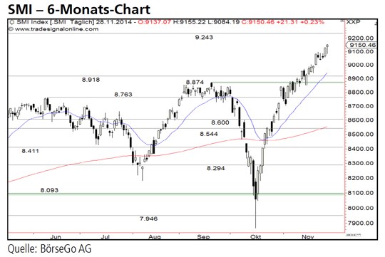 Rückblick: Seit Mitte Oktober stieg der SMI Index in einer massiven, geradlinigen Aufwärtsbewegung in Richtung des bisherigen Jahreshochs bei 8.874 Punkten an und durchbrach die Marke Anfang November.