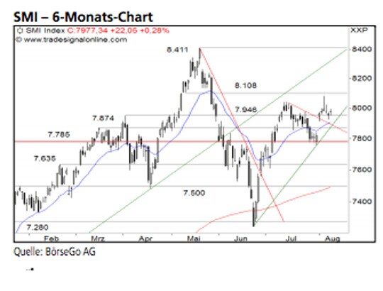 Rückblick: Seit Ende Juni stieg der SMI Index in einer steilen Kaufwelle entlang der Unterseite einer im Mai durchbrochenen mittelfristigen Aufwärtstrendlinie an.