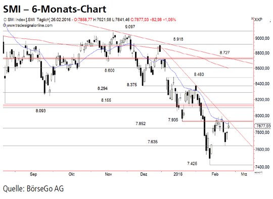 Rückblick: Der SMI Index brach im Februar in einer massiven Verkaufswelle bis weit unter die Haltemarken bei 7.852 und 7.635 Punkten ein und markierte mit 7.425 Punkten ein neues Verlaufstief.