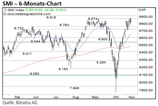 Ausblick: Wenngleich die Freitagskerze aus Bullensicht zur Vorsicht mahnt, kann von einer kurzfristigen Topbildung im Index aus charttechnischer Sicht noch keine Rede sein. Vielmehr ist der SMI Index kurzfristig neutral zu werten. Aus Anlegersicht empfiehlt es sich, prozyklische Signale für eine Neupositionierung abzuwarten. Die Long-Szenarien: Der weiter massgebliche Widerstand im Chart liegt bei 8.874 Punkten. Sollte der Index diese Hürde in den kommenden Tagen überwinden können, wäre zunächst Platz bis zur Marke von 8.918 Punkten. Dieser Widerstand ist aber als untergeordnet anzusehen. Vielmehr dürfte die Marke von 9.000 Punkten das Interesse der Käufer wecken. Mittelfristig wären sogar deutlich höhere Kurse über 9.200 Punkte ableitbar. Die Short-Szenarien: Kurzfristige Abgaben in Richtung der Unterstützungen bei 8.763 und 8.722 Punkten sollten nach dem gescheiterten Ausbruchsversuch auf der Oberseite einkalkuliert werden. Dort dürften die Käufer versuchen, den SMI Index wieder zu stabilisieren. Erst unter 8.722 Punkten würde sich das Chartbild eintrüben. Abgaben auf 8.600 Punkte wären wohl die Folge. Doch spätestens bei 8.544 Punkten ist der SMI Index sehr gut unterstützt.