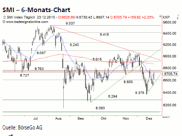Rückblick: Nachdem der SMI Index im November nicht überdie Barriere bei 9.097 Punkten angetrieben werden konnte,setzte eine Gegenbewegung ein, die bislang andauert