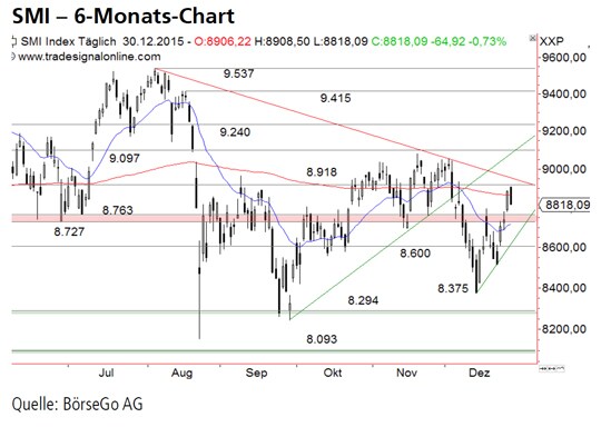 Ausblick: Am Freitag erreichte der SMI bereits die Kurshürde bei 8.918 Punkten. Damit steht als nächste Aufgabe für die Bullen der Ausbruch über diese Marke und die darüber verlaufende mittelfristige Abwärtstrendlinie auf der Agenda. Die Long-Szenarien: Steigt der Index getragen von der positiven Entwicklung der letzten Tage über den starken Kreuzwiderstandsbereich von 8.918 bis 8.950 Punkten an, wäre ein weitreichendes Kaufsignal ausgebildet. Damit könnte sich der kurzfristige Aufwärtstrend nochmals bis 9.097 Punkte fortsetzen. An dieser Stelle entscheidet sich der mittelfristige Verlauf. Gewinnmitnahmen könnten zu einer starken Korrektur führen, wogegen ein nachhaltiger Ausbruch über die Marke Aufwärtspotenzial bis 9.240 Punkte eröffnen würde. Die Short- Szenarien: Verlangsamt sich der Aufwärtsimpuls jetzt dagegen, könnte eine leichte Gegenbewegung bis zur Unterstützung bei 8.763 Punkten zurückführen. Dort sollte es zu einem weiteren Anstieg kommen. Dagegen hätte ein Ausverkauf unter 8.727 Punkte einen Einbruch an die Haltemarke bei 8.600 Punkten zur Konsequenz.