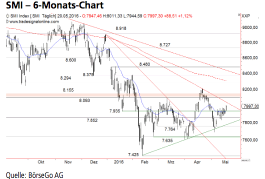 Rückblick: Nach dem Ausbruch über die mittelfristige Abwärtstrendlinie stieg der SMI Anfang April und überwand 8.155. Doch direkt im Anschluss schlugen die Bären zu und drückten den Wert unter die Haltemarken bei 7.852 und 7.764 Punkten.