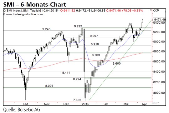 Rückblick: Als der SMI Index Mitte März über sein vorheriges Jahreshoch bei 9.292 Punkten ausgebrochen war, stieg der Index in Folge dieses Kaufsignals zunächst an die Hürde bei 9.400 Punkten.