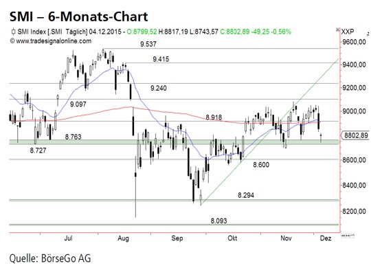 Ausblick: Noch befindet sich der Index in einer breiten Handelsspanne und damit weiter in einer Konsolidierung. Dennoch könnte es jetzt bei weiteren Verlusten zur Aktivierung eines bearishen Doppelhochs kommen, welches ein kurzfristiges Verkaufssignal nach sich ziehen würde. Die Short- Szenarien: Der SMI ist angeschlagen und die Wahrscheinlichkeit eines Bruchs der 8.763 Punkte-Marke aktuell deutlich erhöht. An dieser Einschätzung würde zunächst auch ein Wiederanstieg bis 8.840 und 8.918 Punkte nichts ändern. Dort könnten die Bären wieder eingreifen und mit einer Verkaufswelle für den Bruch der 8.763 Punkte-Marke sorgen. Damit wäre zudem auch das bearishe Doppelhoch bei 9.082 Punkten aktiviert. In der Folge dieses Verkaufssignals würde es zu einem Kursrückgang bis 8.600 Punkte kommen können. An dieser Unterstützung sollte sich der Index jedoch stabilisieren und die Aufwärtsbewegung der letzten Monate fortsetzen. Die Long-Szenarien: Kann der Wert dagegen die 8.763 Punkte- Marke verteidigen und anschliessend auch die Hürde bei 8.918 Punkten zurückerobern, wäre der Verkaufsimpuls neutralisiert. In diesem Fall käme es zu einem weiteren Angriff auf den wichtigen Widerstandsbereich um 9.097 Punkte.