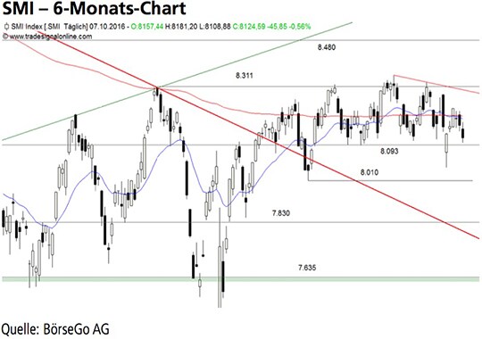 Nach dem Überwinden des mittelfristigen Abwärtstrends wurde dieser Kursausbruch zunächst mit einem Rücksetzer bestätigt, die Notierungen kamen jedoch nicht nachhaltig über die 8.311 Punkte-Marke hinaus. Nachdem der Index dort auch Ende September wieder scheiterte, wurde zuletzt ein kurzfristiger Abwärtstrend etabliert. Dieser führte die Notierungen innerhalb der Handelsspanne der vergangenen Wochen nach unten, sodass die 7.973 Punkte-Marke wieder getestet werden konnte.