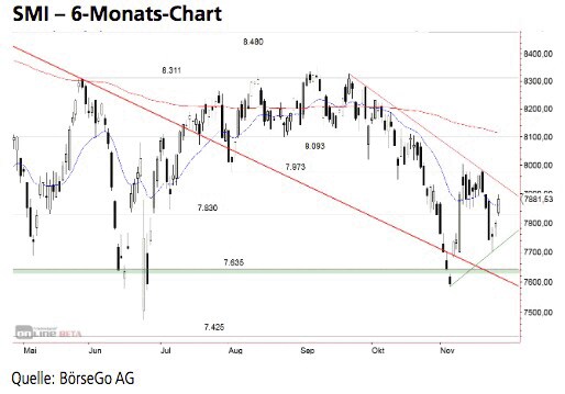 Es kommt somit im SMI Index zu einer Seitwärtsbewegung und beginnenden Ausbildung einer symmetrischen Dreiecksformation. Dies könnte bald eine stärkere Bewegung nach sich ziehen. Die Long-Szenarien: Nachdem es innerhalb der mehrmonatigen Seitwärtsbewegung im Einzugsbereich der 7.635 Punkte-Marke wieder nach oben geht, ist ein Ausbruch aus dem Korrekturtrend der vergangenen Wochen bald möglich. Wichtig wäre der gleichzeitige Ausbruch über die 8.000 Punkte-Marke, um die Möglichkeit eines Kaufsignals zu bieten. In diesem Fall sind Kursgewinne bis in den Bereich der 8.093 Punkte-Marke möglich. Schafft es der Index auch über die 8.093 Punkte-Marke, könnte die Handelsspanne vollständig bis zur mittelfristig wichtigen 8.311 Punkte-Marke durchlaufen werden. Die Short-Szenarien: Ein Rückfall unter die 7.700 Punkte-Marke wäre kurzfristig bearish zu bewerten, da dies aus dem Erholungstrend der Vorwochen führen würde. Abgaben bis zur 7.635 Punkte-Marke sind dann möglich, wobei der Weg auch zur mittelfristig entscheidenden 7.425 Punkte-Marke führen könnte.