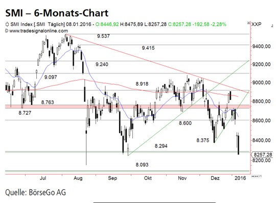 Ausblick: Binnen einer Handelswoche haben die Bären den Anstieg seit Mitte Dezember ausverkauft. Die Gefahr weiterer Verluste ist aktuell enorm hoch. Die Short- Szenarien: Kurzfristig könnte der SMI im Bereich von 8.294 Punkten eine Stabilisierung beginnen und anschliessend eine Erholung bis an die Hürde bei 8.375 Punkten einleiten. Dort dürfte allerdings die nächste Abwärtsbewegung starten und den Index erneut unter die 8.294 Punkte-Marke drücken. Damit wäre die markante Unterstützung durchbrochen und mit einem Abwärtsimpuls bis an die 8.093 Punkte-Marke zu rechnen, ehe eine breite Bodenbildungsphase einsetzen dürfte. Unterhalb dieses Tiefs droht jedoch ein Ausverkauf bis 7.950 Punkte. Die Long-Szenarien: Sollte der SMI in den nächsten Tagen wider Erwarten über die 8.480 Punkte-Marke ansteigen, wäre die kurzzeitige Baisse zwar nicht beendet, aber eine Fortsetzung der Erholung bis 8.600 Punkte wahrscheinlich. An dieser Barriere dürften die Bären wieder aktiv werden und einen erneuten Kursrutsch auslösen. Aktuell wäre erst ein Ausbruch über den Widerstand bei 8.727 Punkten bullish zu werten.