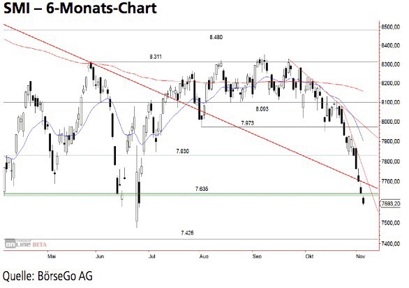 ... als Dreifachtop dar, welches im Oktober nach unten aufgelöst wurde. Die Unterstützung bei 7.973 Punkten hielt dem stand, es gelang jedoch nur ein Rücklauf an die 8.093 Punkte-Marke. Hier rutschte der Index ab und konnte die 7.830 Punkte-Marke nicht halten. Der Rückfall unter diese Unterstützung zog eine verschärfte Verkaufswelle nach sich, welche auch unter den durchbrochenen Abwärtstrend zurückführte.