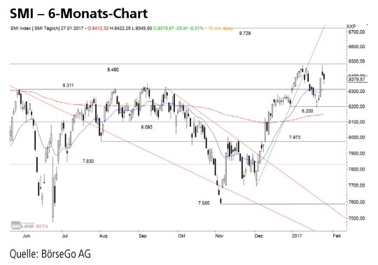 Rückblick: Nach dem Ausbruch über den Widerstand bei 8.311 Punkten setzte der SMI Index seine mittelfristige Aufwärtstendenz fort und erreichte Anfang Januar dieses Jahres den Widerstand bei 8.480 Punkten.
