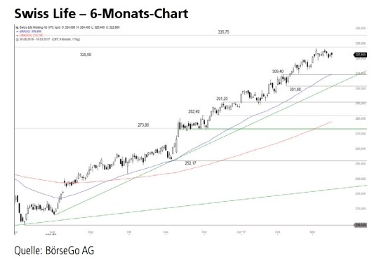 Rückblick: Seit einer Trendwende im Juni 2016 befinden sich die Aktien von Swiss Life in einer geradlinigen Aufwärtsbewegung, die im Februar dieses Jahres zum Anstieg über die Widerstandsmarke bei 309,40 CHF führte.