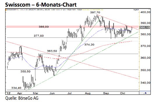 Ein Ausbruch über die Abwärtstrendlinie würde ein weiteres Kaufsignal ausbilden und für eine Fortsetzung des Aufwärtstrends der Aktien von Swisscom sprechen. Dagegen würde ein Ausverkauf unter 377,50 CHF das Chartbild eintrüben. Die Long-Szenarien: Steigt der Wert über die kurzfristi- gen Widerstände bei 388,20 und 390,00 CHF an, dürfte eine Kaufwelle bis zum Rallyhoch bei 397,70 CHF einsetzen. Sollte im weiteren Verlauf auch diese Marke überschritten werden, wäre ein mittelfristiges Kaufsignal mit einem ersten Ziel bei 412,20 CHF gebildet. Oberhalb dieser Marke könnte sich die Hausse bereits bis 433,50 CHF fortsetzen. Die Short-Szenarien: Ein Rückfall unter 377,50 CHF auf Tagesschlusskursbasis wäre dagegen bearish zu werten. Zunächst könnten die Aktien bis 363,50 CHF ausverkauft werden. An dieser Stelle könnte es zu einer Erholung kommen. Sollte diese Marke jedoch ebenfalls durchbrochen werden, könnte ein starker Kursrutsch bis zur Unterstützung bei 350,50 CHF einsetzen.