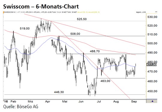 Ausblick: Nach der kleinen Bodenbildung im Juni oberhalb der 446,30 CHF-Marke ist die Chance gegeben, auch grössere Kaufsignale zu aktivieren. Anschlusskäufe sind jedoch noch nötig. Bleiben diese aus, könnte es im Herbst innerhalb des mittelfristig aktiven Abwärtstrendkanals noch einmal ungemütlich werden. Die Long-Szenarien: Nach dem erfolgreichen Test der 463,00 CHF-Marke ist kurzfristig die Chance eines Anstiegs bis zur 488,70 CHF-Marke gegeben. Schaffen es die Bullen auch darüber hinaus, wird ein Angriff auf den bei 500,00 CHF liegenden mittelfristigen Abwärtstrend möglich, welcher zunächst noch einmal belasten kann. Das Überwinden der 488,70 CHF-Marke würde jedoch für eine grössere Bodenbildung sprechen, welche die Notierungen auch über den Abwärtstrend hinausführen könnte. Oberhalb der 500,00 CHFMarke würde sich entsprechend Potenzial bieten, um einen möglichen Anstieg bis zur 508,00 CHF-Marke und darüber zur wichtigen 525,50 CHF-Marke einzuleiten. Die Short-Szenarien: Abgaben unter die 463,00 CHF-Marke wären bei Swisscom kurzfristig bearish zu bewerten und würden ein Verkaufssignal darstellen. In diesem Fall könnte eine Verkaufswelle bis zur 446,30 CHF-Marke anstehen. Darüber hinaus besteht die Möglichkeit, die Unterkante des mittelfristigen Trendkanals zu erreichen, welche derzeit bei 435,00 CHF verläuft.