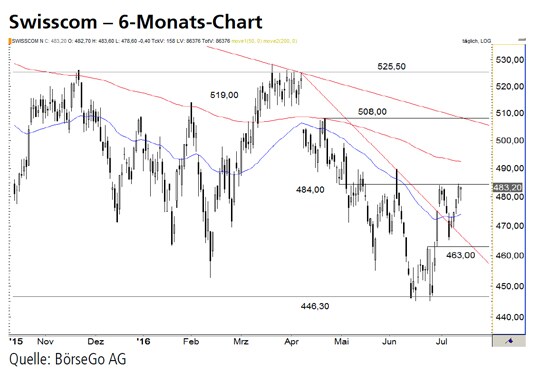 Ausblick: Der kleine Boden, ausgehend von der wichtigen Unterstützungszone bei 446,30 CHF, sollte die Bullen weiter beflügeln. Es besteht die Chance, aus dieser Situation heraus eine grössere Bodenbildung zu beginnen. Der mittelfristige Abwärtstrend ist jedoch aktuell noch aktiv. Die Long-Szenarien: Anschlusskäufe wären nun wichtig, um mit dem Anstieg über die 484,00 CHF-Marke ein weiteres Kaufsignal ausbilden zu können. Gelingt dies, sind Kursgewinne bis in den Bereich der 508,00 CHF-Marke möglich. Der hier ebenfalls verlaufende Abwärtstrend könnte jedoch nochmals abwärts drücken. Schafft es die Käuferseite, die Aktien von Swisscom über die 508,00 CHF-Marke zu führen, wäre dies ein bullishes Signal, welches einen Anstieg bis zur mittelfristig entscheidenden Widerstandszone um 525,50 CHF einleiten könnte. Eine breit angelegte Bodenbildung wäre erst oberhalb der 525,50 CHFMarke wahrscheinlich. Die Short-Szenarien: Bereits an der Widerstandsmarke bei 484,00 CHF besteht die Gefahr eines Rückschlags. Sollte dabei auch die 463,00 CHF-Marke unterschritten werden, könnte eine sich anschliessende Verkaufswelle auch unter die 446,30 CHF-Marke führen. In diesem Fall besteht die Gefahr, dass sich der Kursrückgang mittelfristig in Richtung der 400,00 CHF-Marke beschleunigen könnte.