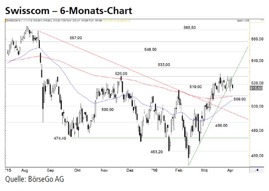 Ausblick: Die Aktien von Swisscom haben mit dem Anstieg der letzten Wochen die Weichen für eine Fortsetzung der Aufwärtsbewegung gestellt. Ein weiteres Kaufsignal ist in Sichtweite. Die Long-Szenarien: Kann der Wert über 509,00 CHF verbleiben, dürfte die Käuferseite den Widerstand bei 519,00 CHF und darüber die Hürde bei 526,00 CHF in Angriff nehmen. Werden beide Barrieren durchbrochen, käme es zu einer Kaufwelle bis 548,50 CHF. Dort könnte ein Rücklauf an die 526,00 CHF-Marke starten, ehe ein weiterer Aufwärtsimpuls bereits über 548,50 CHF und in Richtung der zentralen Widerstände bei 557,00 und 568,50 CHF führen könnte. Die Short- Szenarien: Fallen die Aktien dagegen aus der Seitwärtsspanne nach unten, würde die Unterstützung bei 500,00 CHF wieder Halt bieten können. Dort sollte ein weiterer Anstieg einsetzen. Ein Kursrutsch unter diese Marke würde die Korrektur dagegen zeitlich verlängern und zu Abgaben bis 486,00 CHF führen. Auch auf diesem Kursniveau hätten die Bullen nochmals die Chance, die Erholung fortzuführen. Unter der Marke käme es dagegen zu einem Ausverkauf bis 463,20 CHF.