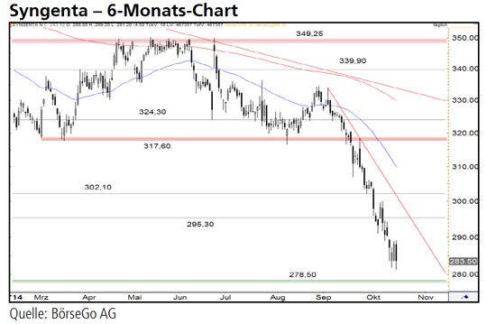 Ausblick: Der Abwärtstrend der Aktien von Syngenta ist ungebrochen. Dennoch könnte es aus unserer Sicht ausgehend von 278,50 CHF zu einer mehrtägigen Erholung kommen. Die Short-Szenarien: Zunächst sollte sich die Verkaufswelle bis an eben diese Marke fortsetzen, dort jedoch eine Bodenbildung erfolgen. Kann der Wert anschliessend über die kleine Hürde bei 291,28 CHF ansteigen, würde der Widerstand bei 295,30 CHF angegriffen werden. Ein Ausbruch über die Marke könnte zu einer Ausweitung der Gegenbewegung bis 302,10 CHF führen. Dort sollten die Bären den Abwärtstrend jedoch ein weiteres Mal bis 278,50 CHF fortsetzen. Ein Rückfall unter diese wichtige Unterstützung hätte weitere Verluste bis 266,00 und 255,00 CHF zur Folge. Auf mittlere Sicht könnte es sogar zu einem Einbruch bis 248,90 CHF kommen. Die Long-Szenarien: Führt eine einsetzende Erholung den Wert dagegen über die Barriere bei 302,10 CHF, wäre ein kurzfristiges Kaufsignal aktiv. In diesem Fall könnte es zu einem zügigen Anstieg bis 317,60 CHF kommen. Dieser könnte sich bei einem Ausbruch über die Marke bis 324,30 CHF fortsetzen.