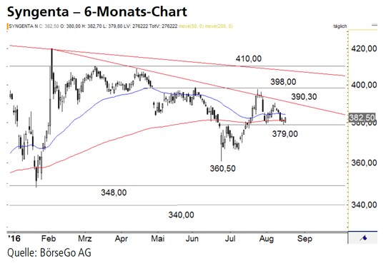Ausblick: Die kommenden Tage müssen zeigen, was der Anstieg bei den Aktien von Syngenta seit Juni wert war. Bislang hat der Rücklauf bullishe Züge. Die Long-Szenarien: Kurzfristig steht klar die Marke von 379,00 CHF im Fokus. Etablieren sich die Aktien auch in den kommenden Tagen über dieser technisch wichtigen Unterstützung, kann die Erholungssequenz seit Juni in die Verlängerung gehen. Ein erstes Anlaufziel stellt in diesem Fall die seit Februar intakte Abwärtstrendlinie dar, die zusammen mit dem Augustzwischenhoch bei 390,30 CHF einen Kreuzwiderstand im Chart bildet. Dort müssen sich die Käufer erst noch beweisen. Reicht der Kaufdruck aber auch aus, um diese Hürde zu nehmen, wäre ein weiterer Anlauf auf die Hürde bei 398,00 CHF zu erwarten. Erst ein Anstieg über diese Marke würde einem mittelfristigen Trendwechsel gleichkommen. Die Short-Szenarien: Geben die Aktien von Syngenta indes den wichtigen Support bei 379,00 USD auf, wäre die kurzfristige Bodenbildung erst einmal gescheitert. Das Junitief bei 360,50 CHF dürfte in diesem Fall die nächste Anlaufmarke darstellen. Kommt es auch zu einem Bruch dieses Mehrmonatstiefs, dürfte das Jahrestief bei 348,10 CHF wieder zum Thema werden. Tiefere Kurse dürfte es aber wohl nur geben, wenn die Übernahme durch ChemChina doch noch scheitert.