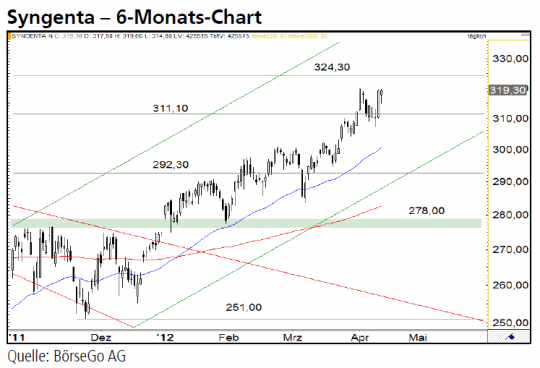 Ausblick: Die Aktien beindrucken mit relativer Stärke zum Gesamtmarkt und könnten nach unserer Einschätzung ihre Aufwärtstendenz im Anschluss an eine Seitwärtsphase oberhalb von 300,00 CHF fortsetzen. Die Long-Szenarien: Kann der Wert die vorherrschende Kursstärke weiter ausbauen, sollte sich mit einem Ausbruch über den Widerstand bei 324,30 CHF eine Aufwärtsbewegung bis zum Allzeithoch bei 349,25 CHF anschliessen, welche man „long“ handeln könnte. Ein Anstieg über das Niveau von 350,00 CHF hinaus verspräche mittelfristig weitere Gewinne bis 375,00 CHF. Die Short-Szenarien: Ein erneuter Rückfall unter die Unterstützung bei 311,10 CHF würde hingegen weitere Verluste bis 300,00 CHF und darunter bis zur Unterstützung bei 292,30 CHF folgen lassen. Ein Bruch dieser Unterstützung würde die bis dahin positive Grundtendenz der Aktien unterbrechen und dürfte wahrscheinlich zu weiteren Rücksetzern bis 278,00 CHF führen.