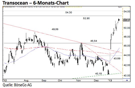 In den vergangenen drei Handelswochen hat sich der Börsenwert der Aktien von Transocean um knapp ein Drittel erhöht. Dieser massive Kursanstieg dürfte sich nach unserer Einschätzung auf mittlere Sicht fortsetzen, doch ist aktuell mit einer leichten Korrektur zu rechnen. Die Long-Szenarien: Kurzfristig könnte der Wert an den Widerstand bei 52,90 CHF und darüber gegebenenfalls bis 54,30 CHF ansteigen, ehe es zu einer vorübergehenden Gegenbewegung kommen dürfte. Diese könnte bis 49,06 CHF führen, ohne die Rally der vergangenen Tage in Frage zu stellen. Von dort aus dürfte es zu einer Fortsetzung der Hausse und bei einem Ausbruch über 54,30 CHF zu einem weiteren Kaufsignal kommen. In diesem Fall könnte der Wert bis 56,75 und 59,50 CHF steigen. Die Short-Szenarien: Sollten die Aktien von Transocean dagegen im weiteren Verlauf unter 49,06 CHF einbrechen, könnte ausgehend von der markanten Unterstützung bei 46,54 CHF ein weiterer Kaufimpuls folgen. Würde diese Haltemarke dagegen unterschritten, wäre mit einer Ausdehnung der Korrektur und einem Ausverkauf bis 43,89 CHF zu rechnen. Ein Rückfall unter dieses Preislevel würde aus unserer Sicht für das vorzeitige Ende der Aufwärtsbewegung der Aktien sprechen. Verluste bis 40,18 CHF müssten in diesem Fall eingeplant werden.