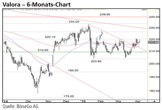 Rückblick: Nach dem Bruch einer langfristigen Aufwärtstrendlinie und dem anschliessenden Unterschreiten der Unterstützung bei 226,50 CHF gerieten die Aktien von Valora ab Juni 2014 massiv unter Druck und fielen bis Mitte Oktober in unmittelbare Nähe der Haltemarke bei 175,00 CHF zurück.
