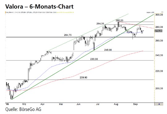Ausblick: Nach dem Rücksetzer auf die 264,75 CHF-Marke könnte das Ende Juni generierte Kaufsignal bereits bestätigt worden sein, sodass sich die Chance bietet, die Rally mittelfristig fortzusetzen. Das Scheitern unter dem gebrochenen Aufwärtstrend bietet aber noch die Möglichkeit, einen zweiten Korrekturschub zu vollziehen. Die Long-Szenarien: Um ein Kaufsignal zu generieren, sollten die Aktien von Valora den Abwärtstrend bei derzeit 281,00 CHF überwinden. Wenn dies gelingt, ist zunächst ein Anstieg bis zum Hoch bei 288,25 CHF möglich. Der gebrochene Aufwärtstrend würde in diesem Kursbereich als Widerstand verstärkend wirken, sodass nochmals eine Korrekturbewegung möglich wäre. Anschliessend hätte der Wert die Chance, auch den langfristigen Abwärtstrend im Bereich der 300,00 CHF-Marke zu erreichen. Mittelfristig würde sich oberhalb dieses Niveaus die Möglichkeit einer umfassenden Rally bis zur 347,00 CHF-Marke bieten. Die Short-Szenarien: Nach dem Scheitern unterhalb der 284,00 CHF-Marke ist ein Rücklauf bis zur Unterstützung bei 264,75 CHF jederzeit möglich. Sollte diese nicht gehalten werden, kann sich die angelaufene Korrektur auch preislich ausdehnen, sodass nochmals die 245,00 CHF-Marke erreichbar wäre. Dort würde sich die Chance bieten, die Korrektur der seit Juli 2015 absolvierten Rally zu beenden.