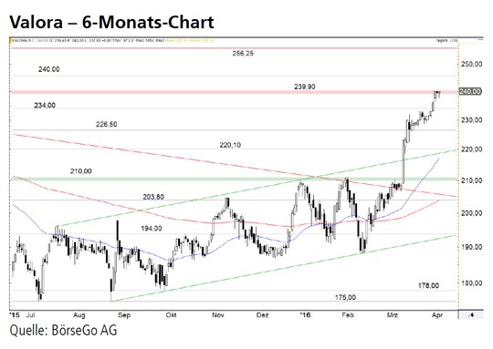 Rückblick: Im vergangenen Jahr gelang es der Käuferseite bei den Aktien von Valora an der Unterstützung bei 175,00 CHF eine mittelfristige Trendwende einzuleiten und den Wert in einer steilen Kaufwelle ab August bis an den Kreuzwiderstand bei 210,00 CHF anzutreiben.