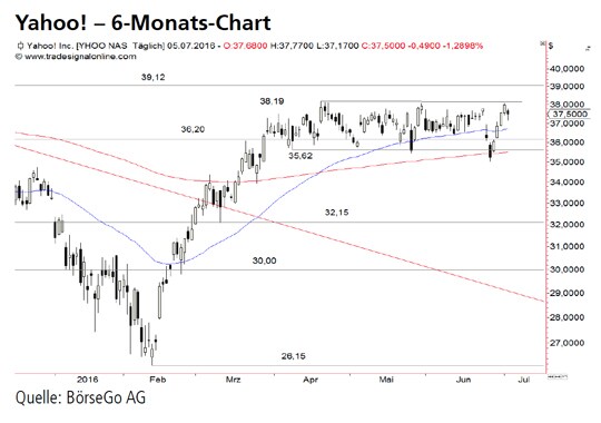 Ausblick: Die Aktien von Yahoo! haben nun die Chance, sich trendbestätigend aus der Seitwärtsbewegung nach oben zu lösen. Zunächst befindet sich der Kursverlauf aber unterhalb einer wichtigen Haltemarke bei 38,19 CHF. Die Long-Szenarien: Treiben die Bullen den Wert über die 38,19 USD-Marke hinaus, wird ein Kaufsignal aktiviert. In diesem Fall bietet sich die Chance auf einen Kurszuwachs bis zur 39,12 USD-Marke, bevor ein leichter Rückgang eingeleitet werden könnte. Ein erfolgreicher Ausbruch über die 38,19 USD-Marke würde vor allem mittelfristig die Chance auf einen grösseren Anstieg bieten. In diesem Fall kommt die Widerstandszone bei 41,72 USD wieder in den Fokus der Anleger, anschliessend die 46,00 USD-Marke. Die Short-Szenarien: Da der Wert am Widerstand bei 38,19 USD nach unten dreht, besteht die Möglichkeit, die Handelsspanne der Vorwochen wieder vollständig zu durchlaufen. Dies würde bedeuten, dass ein nochmaliger Rückschlag bis zur 35,62 USD-Marke folgen könnte. Die Entwicklung in diesem Kursbereich könnte mittelfristig wichtig werden. Sollte die Verkäuferseite die Aktien auch unter die 35,00 USD-Marke drücken, sodass die Handelspanne der Vorwochen nach unten verlassen wird, könnte von einem abgeschlossenen Mehrfachhoch ausgegangen werden. In der Folge wäre eine Abwärtswelle bis in den Bereich der 32,15 USD-Marke und mittelfristig bis zur 30,00 USD-Marke kurzfristig möglich.