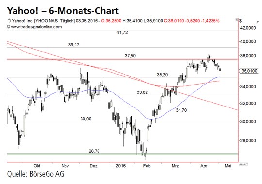 Rückblick: Die Aktien von Yahoo! waren bis zum Februar dieses Jahres innerhalb eines langfristigen Abwärtstrends bis unter das Tief des Jahres 2015 bei 27,20 USD und anschliessend auch unter die Unterstützung bei 26,75 USD eingebrochen.