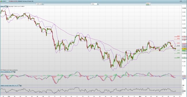 Der DAX schaffte es im gestrigen Handelsverlauf erneut nicht über der Widerstandszone im Bereich bei 11.600/11.630 Punkten zu schliessen und beendete den Handel bei 11.527 Punkte oder 0.5% tiefer. Nach der gestrigen FED-Sitzung bleibt die Wahrscheinlichkeit einer weiteren Zinserhöhung im Dezember hoch welche von Reuters bei 86% geschätzt wird. Damit bleibt der Fokus weiterhin auf den weiteren Konjunkturindikatoren welche Hinweise auf den Zinspfad der FED geben dürften. Der DAX handelt vorbörslich schwächer. Der Fokus liegt auch heute auf den Widerstandsbereich bei 11.600/11.630 Punkte bevor eine Erholung bis in den Bereich 11.800 Punkte anstehen könnte. Nach unten könnte das Novembertief bei 11.400 Punkte ins Visier genommen werden.