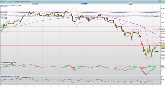 Der DAX schloss gestern knapp über 11.500 Punkte und fiel im späten US-Handel sogar bis auf 11.400 Punkte. Von diesen Tiefstständen kann sich der deutsche Leitindex vorbörslich erholen und notiert derzeit bei etwa 11.650 Punkten. Ohne eine starke Performance des Börsenschwergewichts Bayer gestern, hätte der Abverkauf noch deutlich stärker ausfallen können. Bayer legte in der Spitze um nahezu 8% zu nachdem aus den USA Anzeichen kommen, dass die Abfindungszahlungen aus einer Glyphosat-Anklage deutlich geringer ausfallen könnten als angenommen. Eine weitere Erholung könnte den DAX über das gestrige Tageshoch bei 11.700 Punkte heben, jedoch bleiben die Risiken eines erneuten Rücksetzers hoch. Insbesondere die anstehende Landtagswahl in Bayern könnte bei entsprechend schlechtem Ausgang für die CSU den Druck in der Bundesregierung erhöhen und die ohnehin angespannte Koalition zerbrechen lassen.