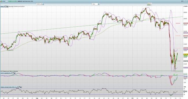 Der Dow Jones schloss gestern erneut negativ und fiel um 2.13% auf 25.052 Punkte. Der weitere Abverkauf konnte erst beim 200 Tage-EMA aufgehalten werden. Sollte diese Marke auf Wochenbasis jedoch nach unten durchbrochen werden, könnten Handelsalgorythmen auf einen Bärenmarkt umschalten und den Einbruch weiter beschleunigen. Am frühen Vormittag handeln die Indizes jedoch wieder deutlich positiv mit dem Dow Jones bei derzeit 25.500 Punkte. Die sehr positive Handelsbilanzdaten aus China könnten im Laufe des Tages jedoch für weitere Verstimmungen im Markt sorgen.
