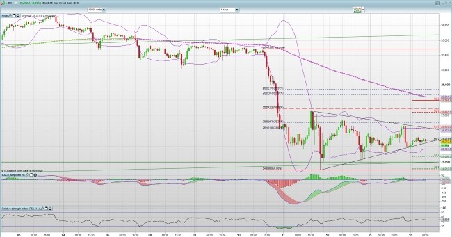 Angeführt von einem schwachen Tech-Sektor fiel auch der Dow Jones zum Ende der Handelssession ins Minus. Apple fiel um 2.1% nachdem sich Goldman Sachs besorgt um den iPhone Absatz in China äusserte da es Anzeichen einer geringeren Nachfrage gibt. Die Berichtssaison startet heute richtig durch und dürfte mit Johnson&Johnson, Netflix, IBM, Goldman Sachs, Morgan Stanley und weiteren Unternehmen den Handelstag prägen. Der Dow handelt weiterhin nur knapp über seinem 200-Tage EMA bei 24.950 Punkten und könnte, bei schlechten Unternehmenszahlen, diese Marke kurzfristig erneut testen. Nach oben gilt es den Widerstand bei 25.500 Punkten zu überwinden um weiteres Aufwärtspotential zu eröffnen.