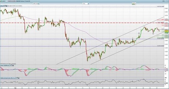 Der heute Morgen veröffentlichte Importpreisindex für Deutschland war sowohl für den Monat Juli als auch auf Jahresbasis schlechter als erwartet ausgefallen. Der DAX verliert leicht und steht aktuell mit 12.525 Punkten unter dem heutigen Pivot Punkt und nur noch knapp über der S1 Unterstützung. Sollte der DAX unter die 12.500 Punkte Unterstützung fallen könnte eine Anschlussreaktion bis in den Bereich 12.400 Punkte anstehen. Ein Ausbruch über den Pivot Punkt bei 12.551 Punkten dürfte einen positiven Handelsimpuls geben und ein erneuter Test des Widerstandsbereichs bei 12.600 bedeuten.