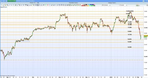 Die Zinsangst hat dem S&P500 den grössten Wochenverlust seit Anfang 2016 beschert. In seinem Sog fiel auch der DAX unter die psychologisch wichtige Marke von 13.000 Punkten und brach in der Folge auch das bisherige Jahrestief bei 12.742 Punkte.